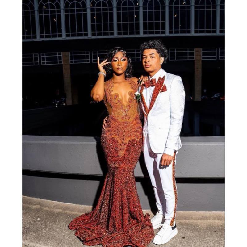 A coordinated look between couples is one of the biggest prom trends for 2026. Matching your custom prom suit with your partner’s gown — using the same color tone, fabric, or embellishment — creates a powerful and romantic impression.