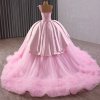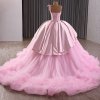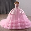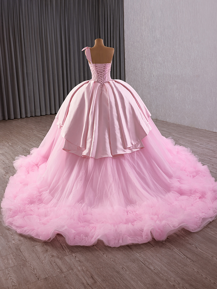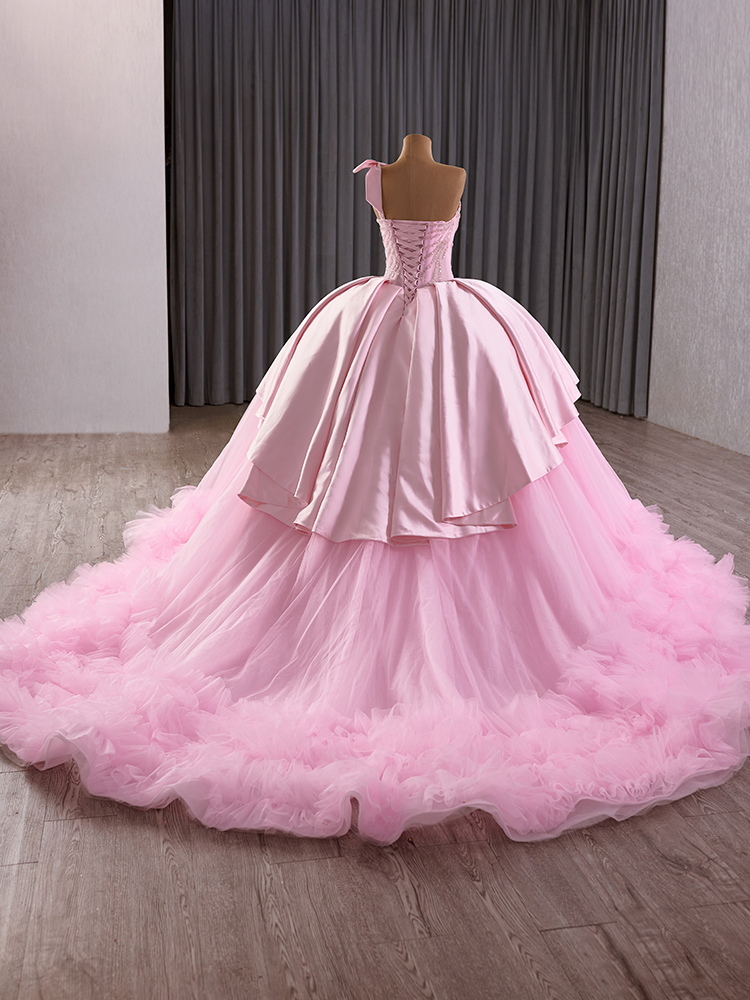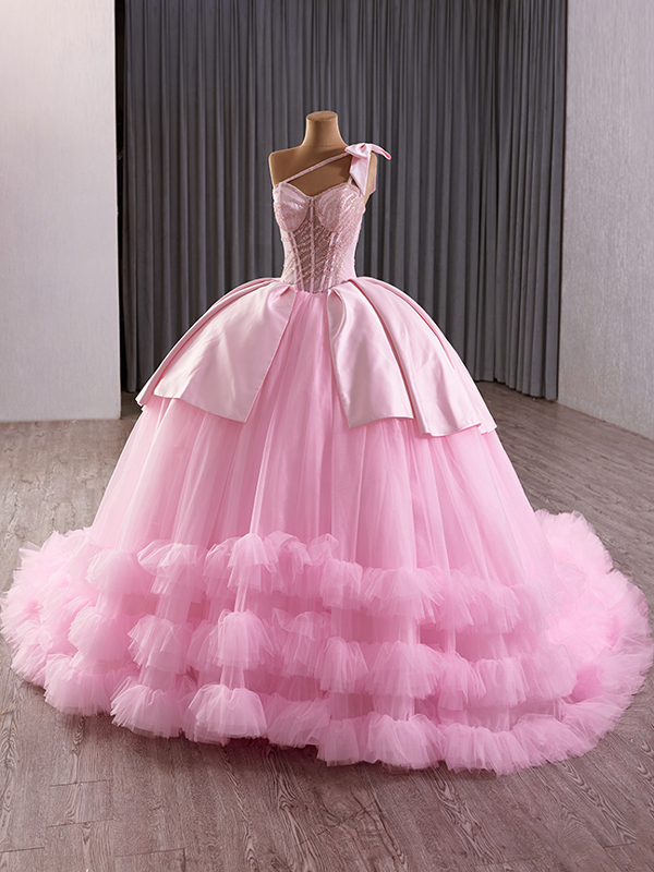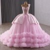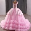 Luxury Model Pink Spaghetti Strap Bow Sleeveless Tiered Ball Gown Quinceanera Dress 251015
